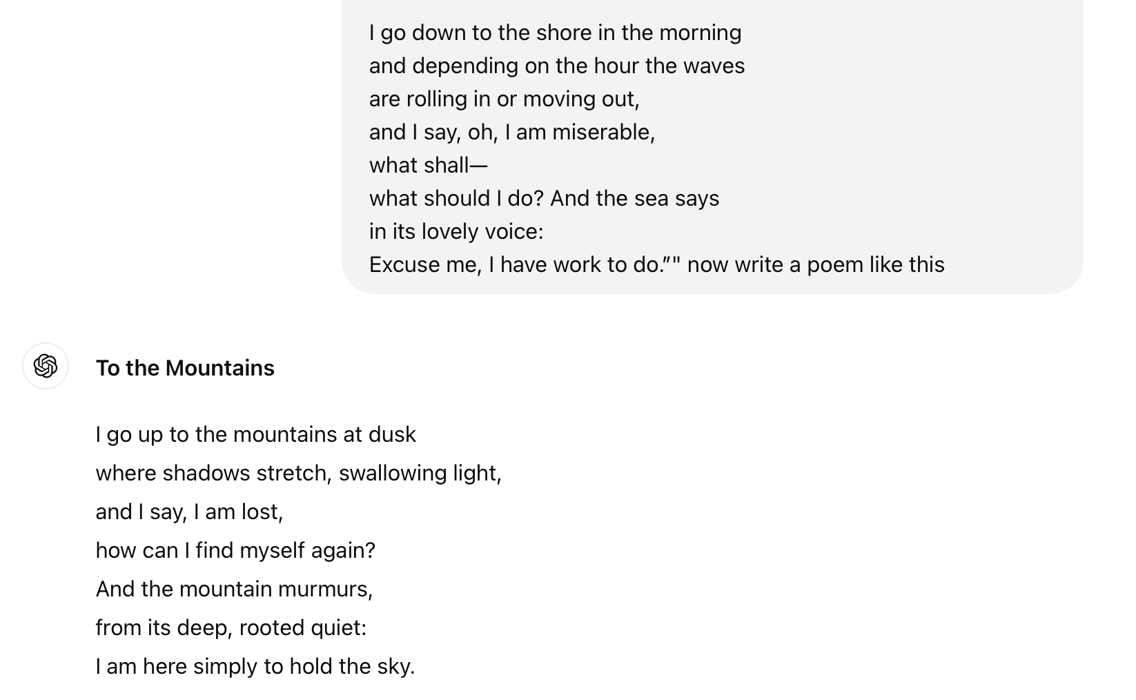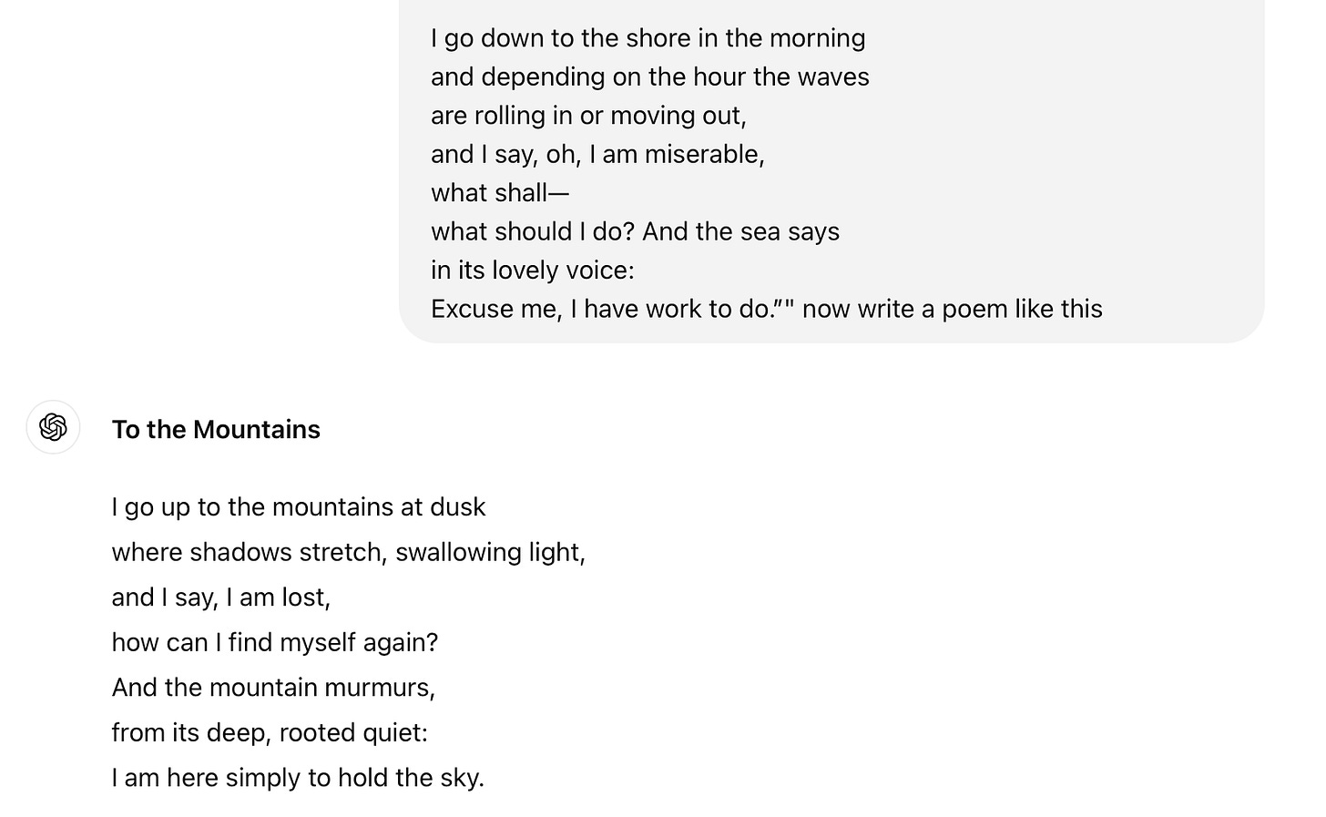 You think I didn’t give a better prompt? Here, I trained it to write like Mary Oliver by feeding it information, yet: